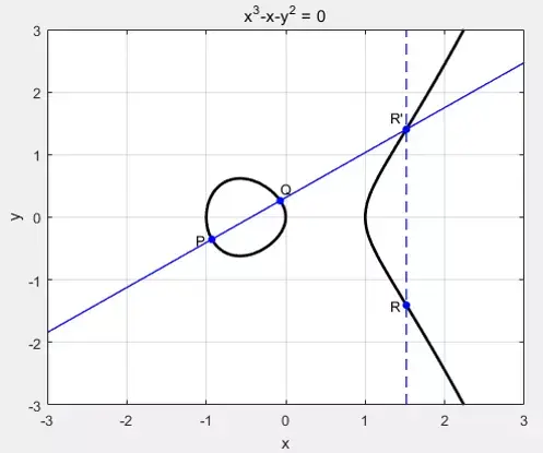 定义椭圆曲线上的加法。 现在有椭圆曲线y^2 = x ^ 3 - x,曲线上的点P和Q。过P和Q做一条直线,交椭圆曲线为点R',再过R'点做垂直于X轴的直线,交曲线另一点为R,定义P + Q = R。如下图所示。