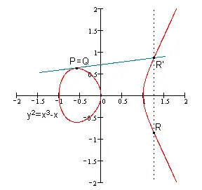 若P=Q,则为过P点的切线交于椭圆曲线为R'。如下图所示。