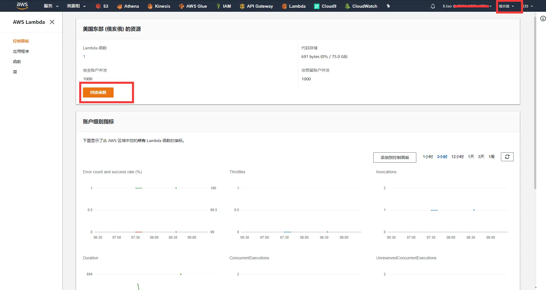 - 在lambda区域中选择第一步创建lambda中所选的region