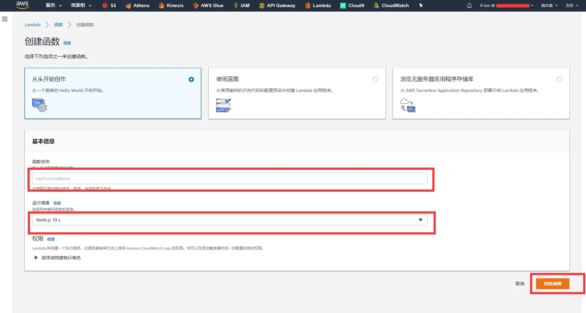 选择创建函数(Create a function),进入函数创建页面