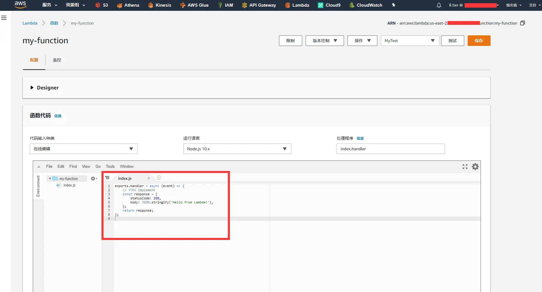 选择 Create function。函数创建成功,进入lambda在线编译环境