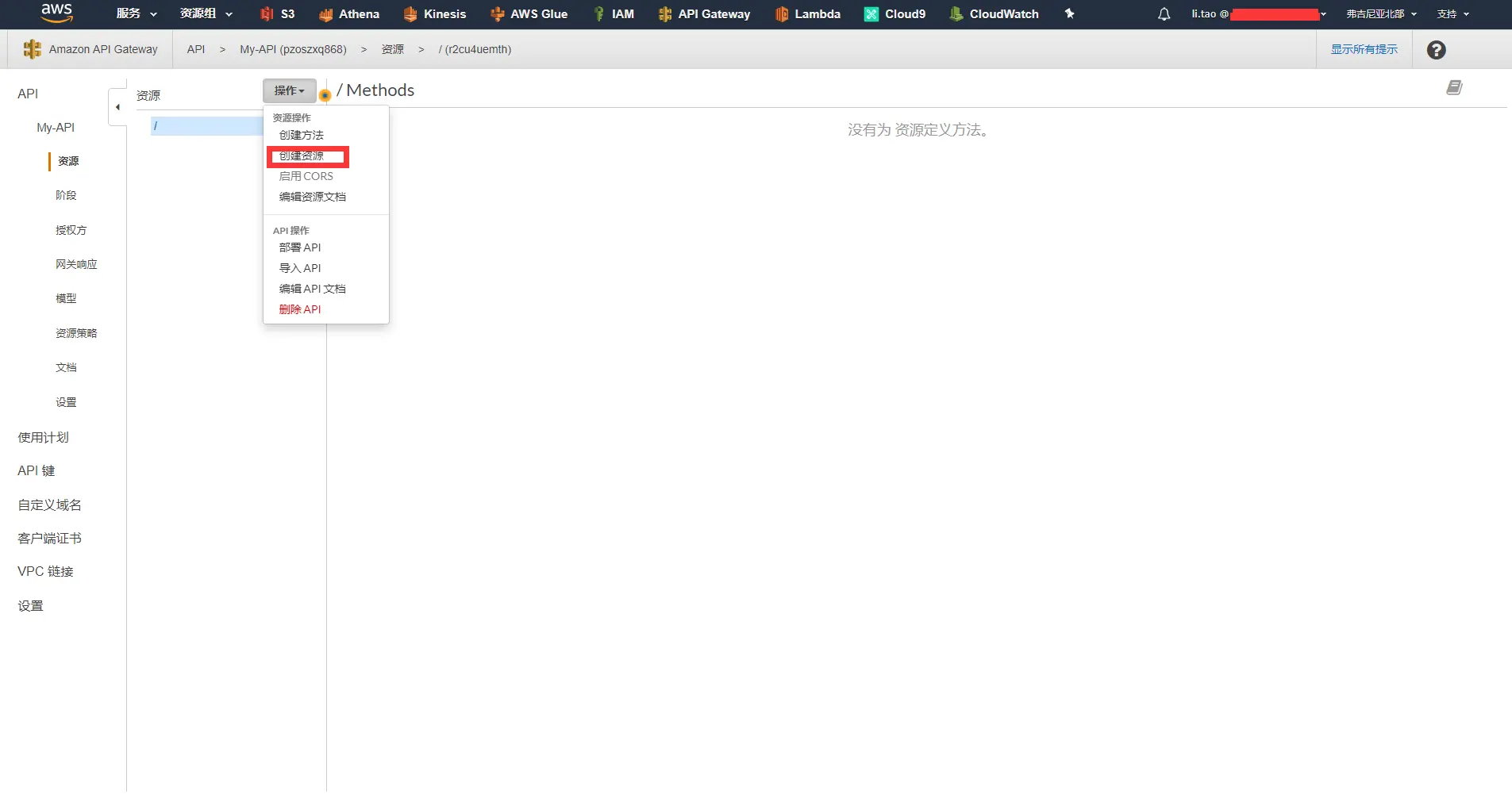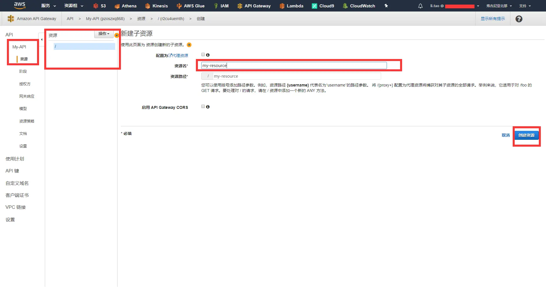 - 为My-API创建资源,选择操作中的创建资源,进入资源创建页面