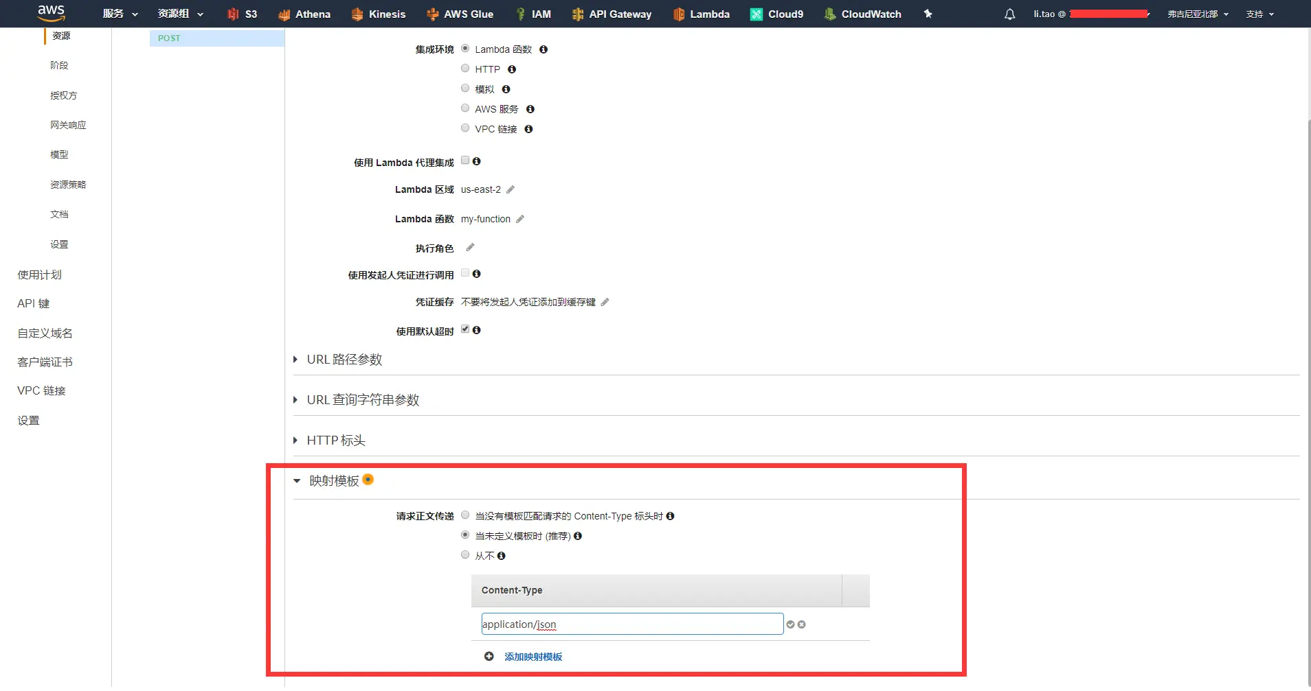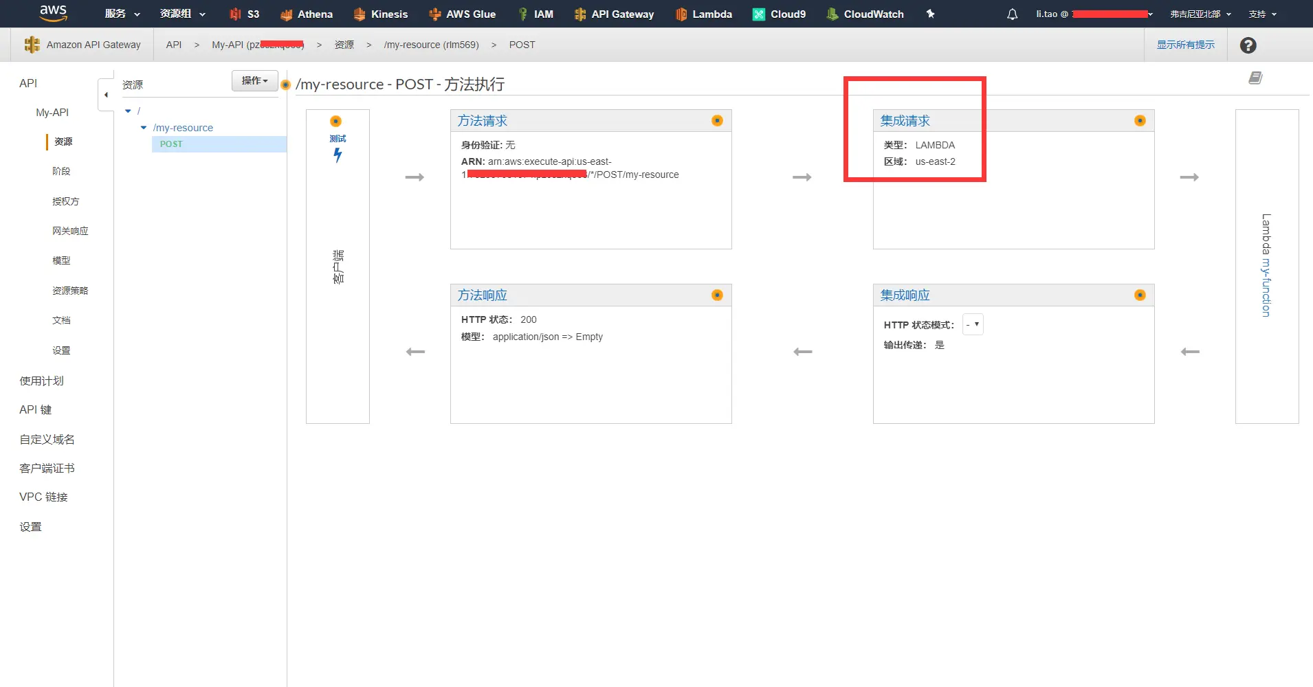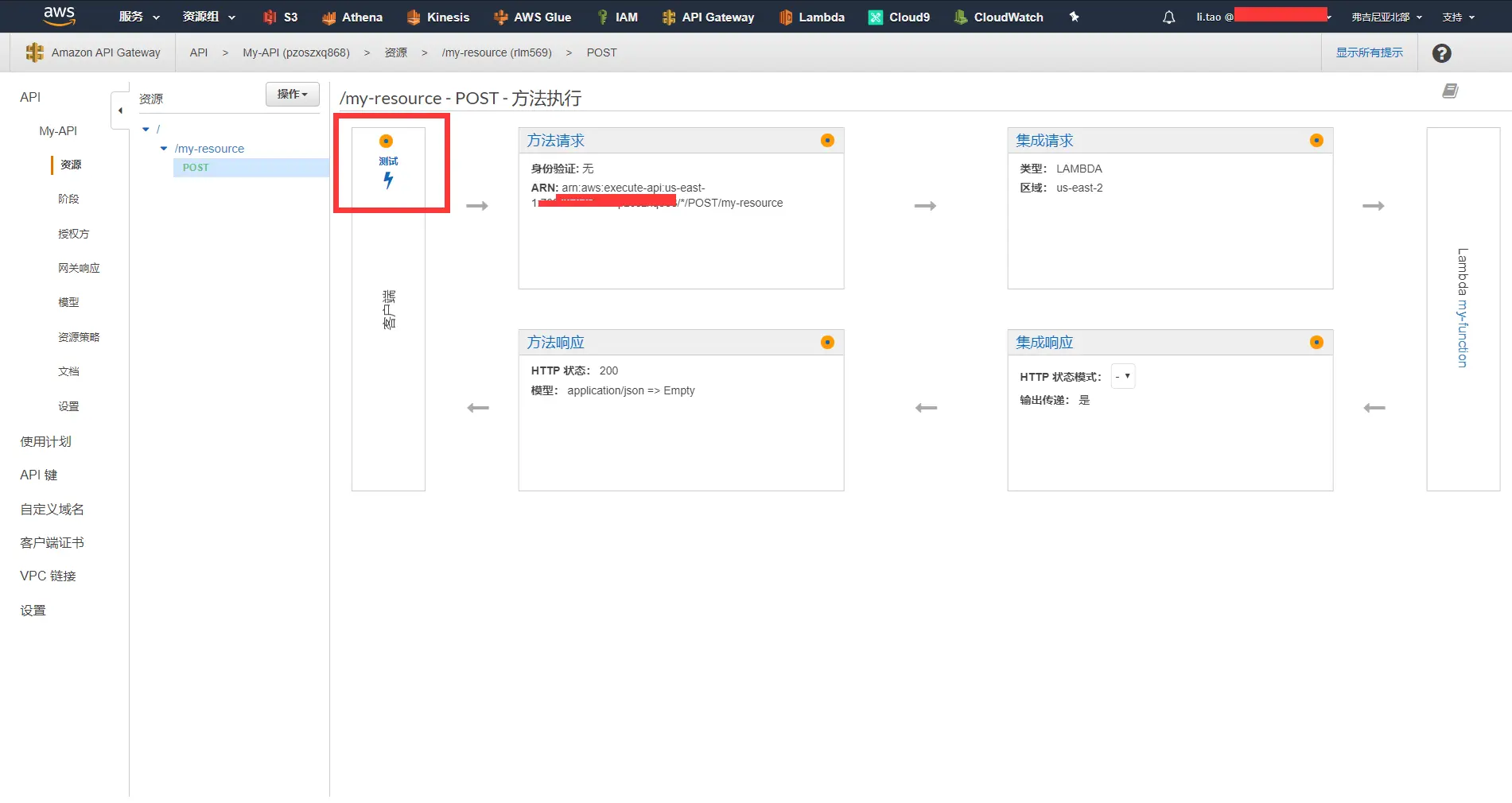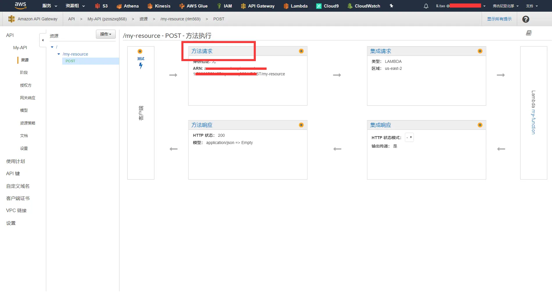 - 在API Gateway控制台中选中API MY-API中的资源/my-resource,并点击post,进入方法执行界面