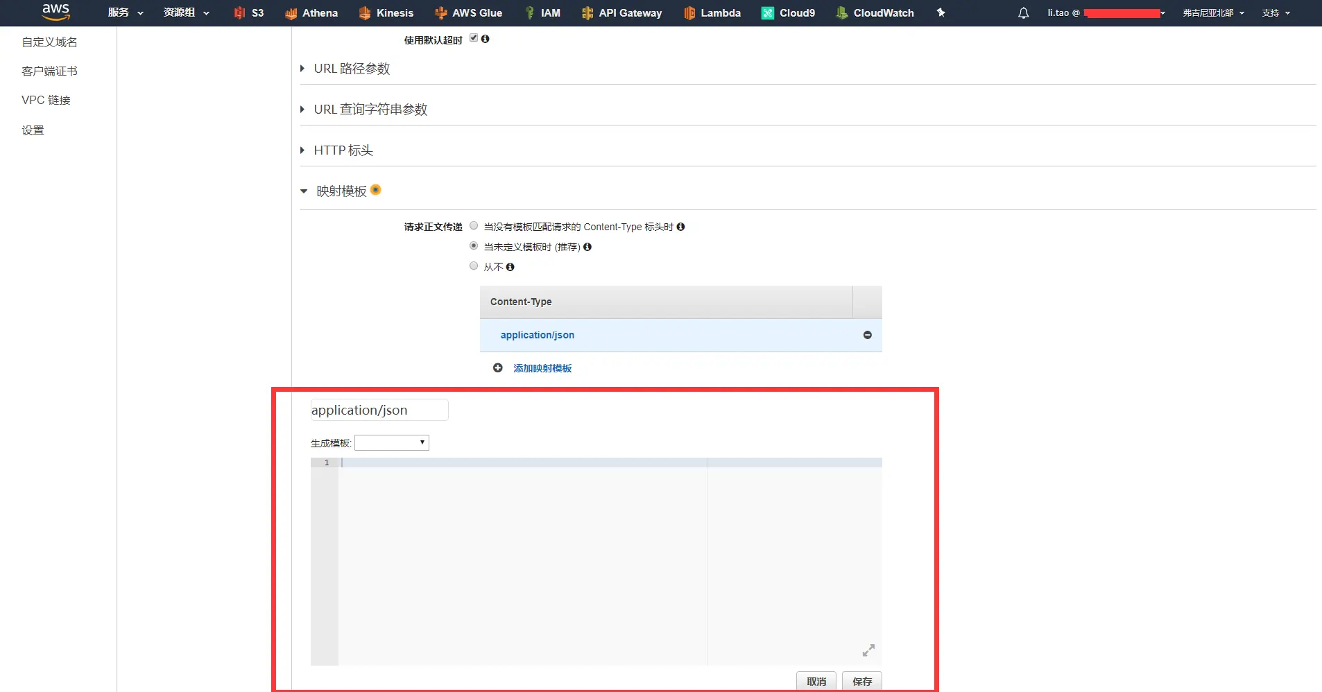 - 在集成请求页面中选择映射模板(用户请求体的信息,如请求头和publicIP就是他通过这儿获取),点击添加映射模板,并在输入框中输入application/json