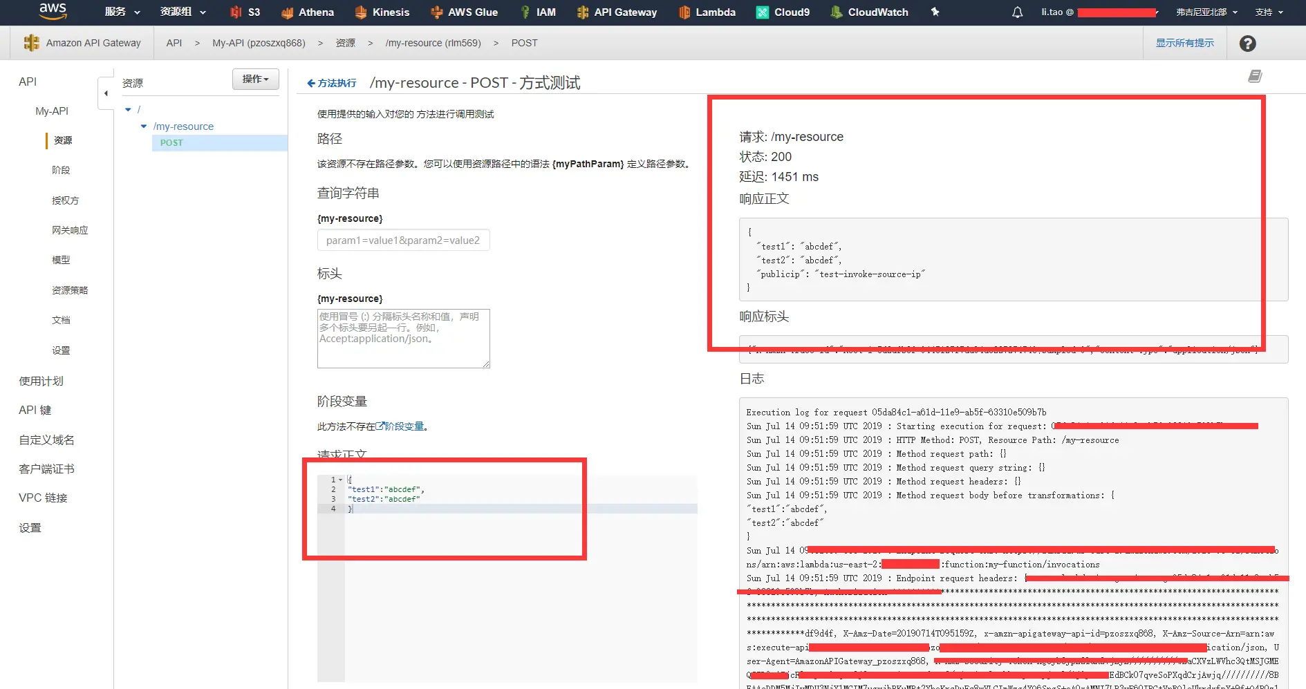 - 使用post方法对URL pzoszxq868.execute-api.us-east-1.amazonaws.com/test/my-resource做请求