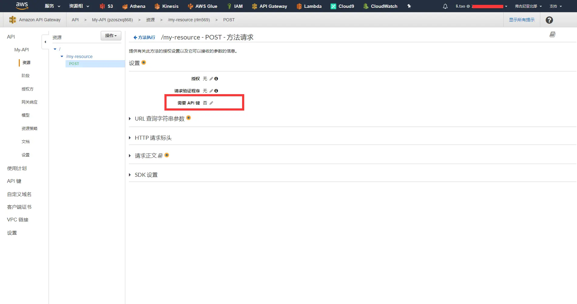 - 在方法执行界面点击方法请求,尽然请求设置界面,并选中需要API键 ,设置为是