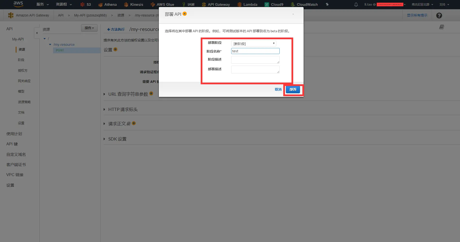 - 在弹出的部署api提示框,中,选中部署阶段下拉框,选择新阶段,在阶段名称中输入test