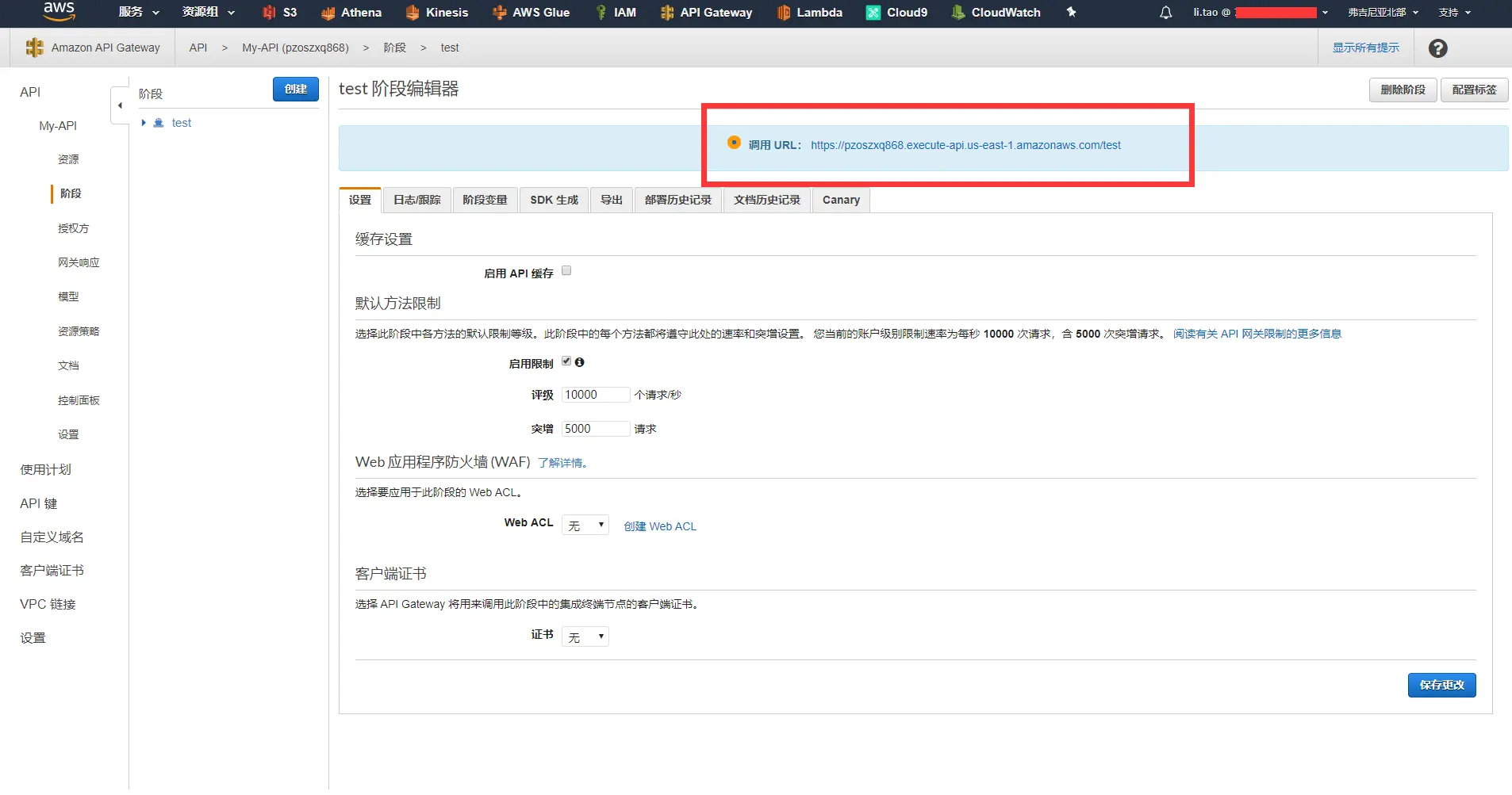 - 点击保存按钮后,跳转阶段界面,部署成功,其中调用 URL: pzoszxq868.execute-api.us-east-1.amazonaws.com/test 就是我们发布出去的api,/my-resource,就是我们调用的方法