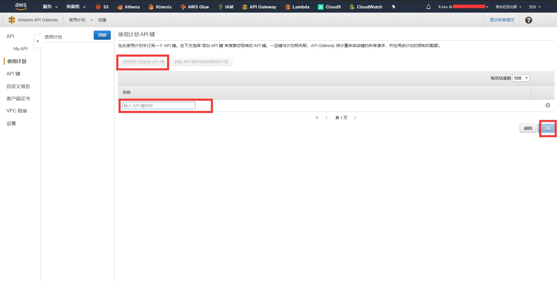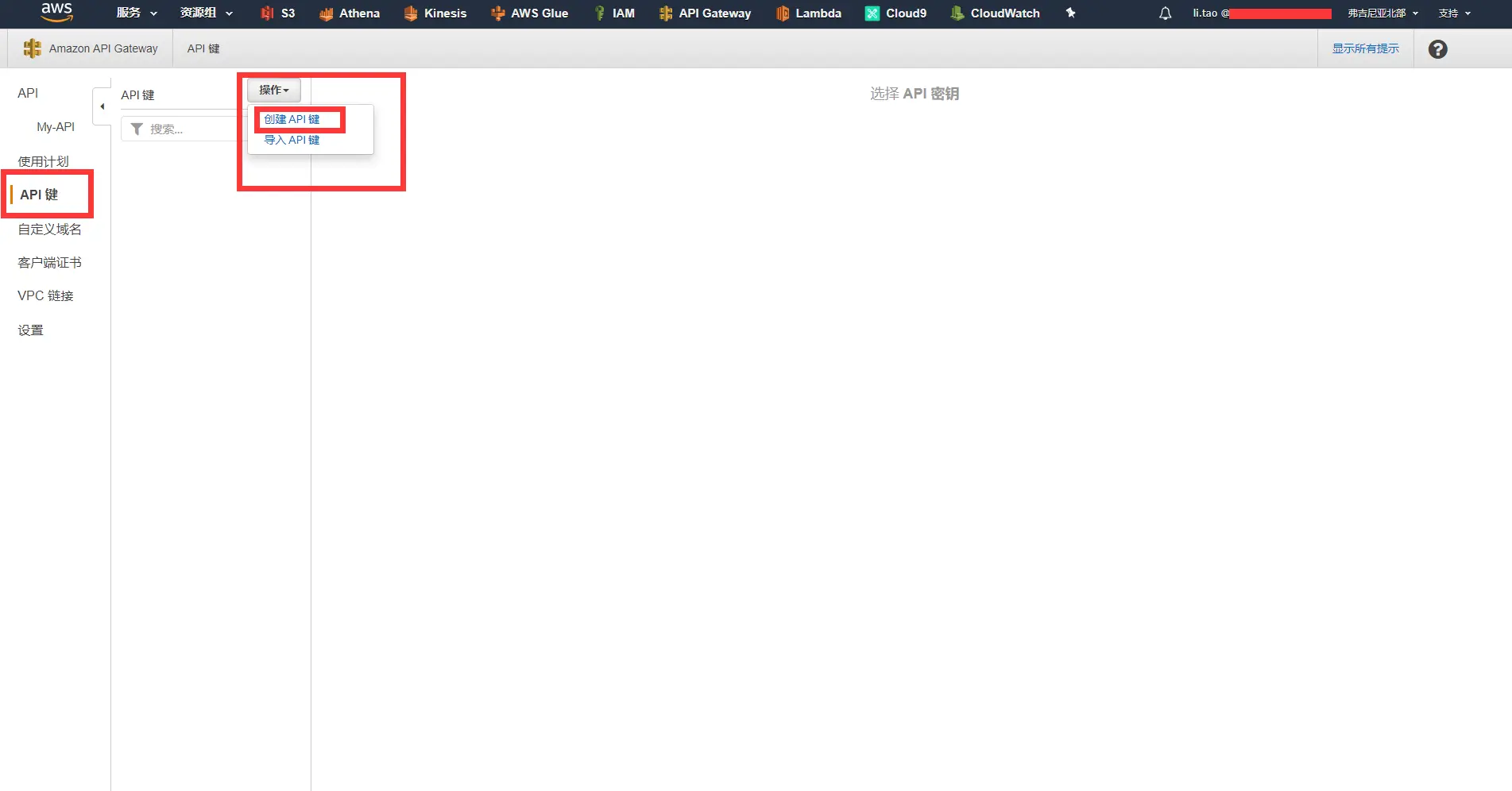 - 在AWS API Gateway控制台中,选中API键,选中操作,在下拉框中选择创建API键