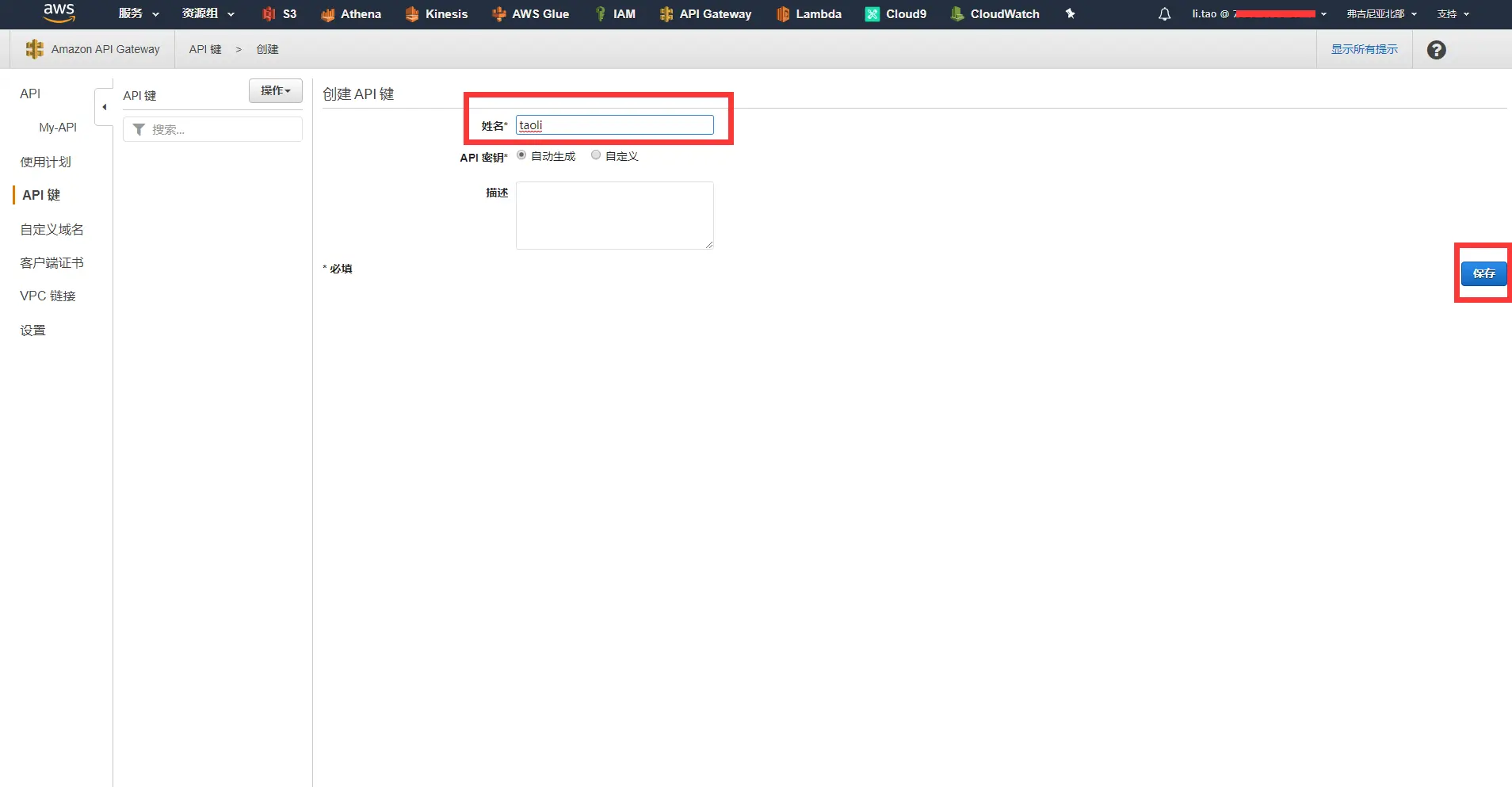 - 在姓名输入框中输入:taoli , API密钥选择自动生成,d点击保存按钮,api 键生成成功