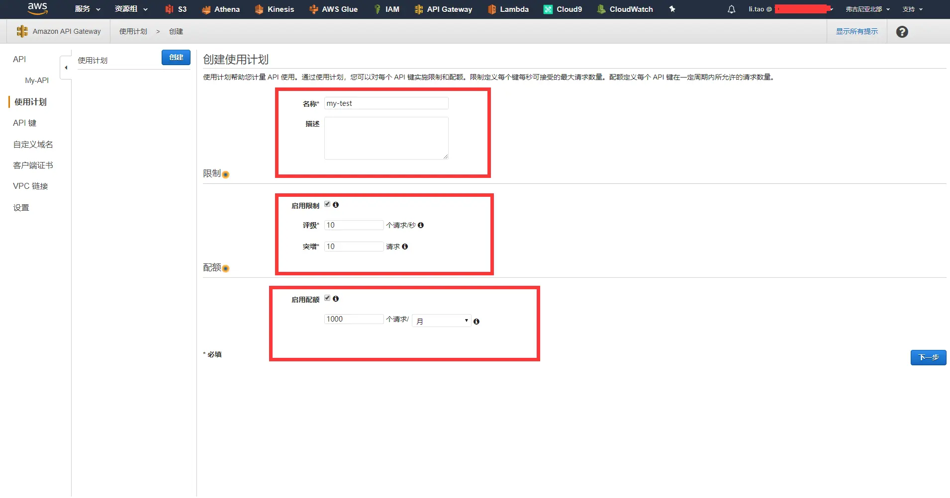 - 在名称中填入my-test ,并根据实际需求填写限制和配额的数量,点击下一步