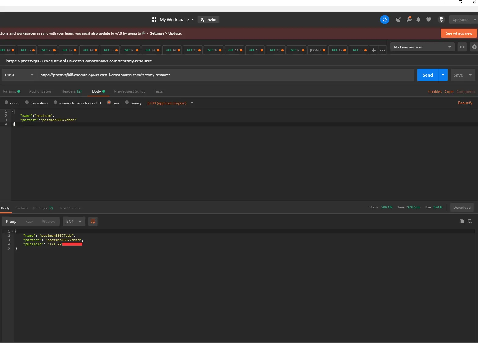{"test1":"abcdef","test2":"abcdef"}- 请求成功后,将返回200,并且再响应参数中多了publicip(因为使用的是aws控制台,无法获取到准确的publicip ,需要本地进行调用才能获取),证明api,编写成功