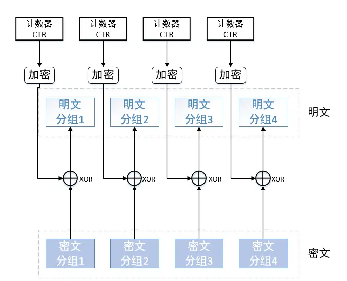 - CTR加密模式是将随机数加密后和明文分组进行按位异或(XOR)操作,即得到密文(所以解密时只要对密文再进行一次按位异或就可以得到明文),下次分组加密时随机数加1,然后再重复分组加密逻辑,如下图