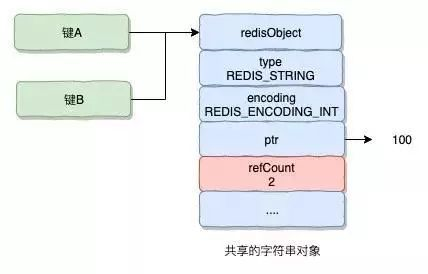 举个例子,假使键 A 创建了一个整数值 100 的字符串作为值对象,这个时候键 B 也创建保存同样整数值 100 的字符串对象作为值对象。