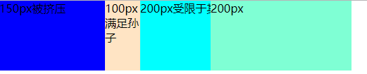 上文代码中二儿子和四儿子的150px,100px是他们flex-basis获取到的,然后老父亲分配完大家的“欲望”后把多余的宽度又根据大家的“剩余分配比例”重新分配了一遍,于是二儿子四儿子又得到了50px。