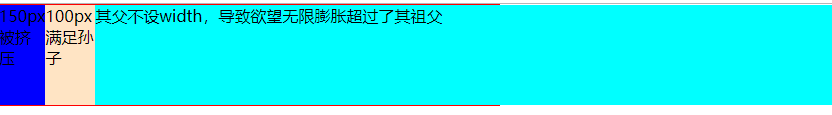 我们可以看到,老父亲对于孙子的“欲望”优先级是高于儿子的“欲望”,由于总需求超过了老父亲的财产,大儿子本来要求的200px被挤压了50px,二儿子得到了他的孩子所需求的100px,而小儿子right由于也有一个想要200px的孩子于是老父亲保留了right的宽度。这里值得一提的是,这里三儿子的孩子,需求一个无穷大的宽度,但是实际只拿了老父亲的200px,因为三儿子设置了他自己的一个width,导致无论他孙子要求多大的东西,最后从老父亲手里拿到的宽度总是无法超过200px。