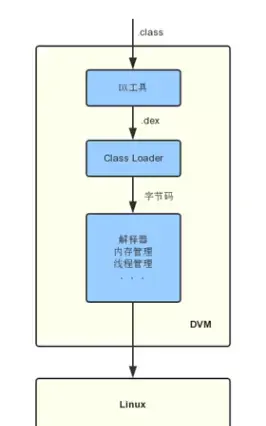 从上图可以看出,首先Java编译器编译的.class文件经过DX工具转换为.dex文件,.dex文件由类加载器处理,接着解释器根据指令集对Dalvik字节码进行解释、执行,最后交与Linux处理。