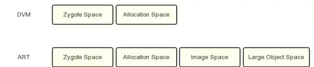 DVM的运行时堆主要由两个Space以及多个辅助数据结构组成,两个Space分别是Zygote Space(Zygote Heap)和Allocation Space(Active Heap)。Zygote Space用来管理Zygote进程在启动过程中预加载和创建的各种对象,Zygote Space中不会触发GC,所有进程都共享该区域,比如系统资源。Allocation Space是在Zygote进程fork第一个子进程之前创建的,它是一种私有进程,Zygote进程和fock的子进程在Allocation Space上进行对象分配和释放。