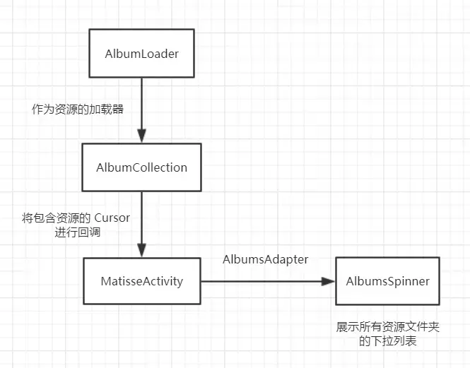 继承了 Cursor 的 AlbumLoader,作为资源的加载器,通过配置与资源相关的一些参数,从而加载资源。AlbumCollection 实现了 LoaderManager.LoaderCallbacks 接口,将 AlbumLoader 作为加载器,其内部定义了 AlbumCallbacks 接口,在加载资源完成后,将包含数据的 Cursor 回调给外部调用的 MatisseActivity,然后在 MatisseActivity 中进行资源文件夹的展示。