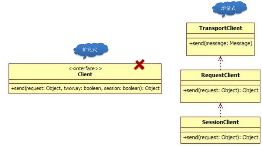 如果现有一个无状态消息发送的场景,后来新增一个会话消息发送需求,如果采用增量式扩展,无状态消息发送原封不动,同步消息发送,在无状态消息基础上加一个 Request/Response 处理,会话消息发送,再加一个 SessionRequest/SessionResponse 处理