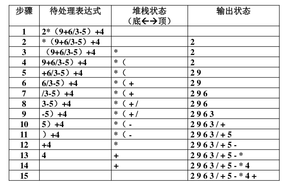 7、整个表达式遍历完之后,则将栈里的元素一一弹出并输出。