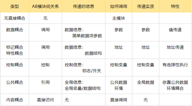 - 降低了软件的可理解性。不容易清楚知道哪些数据被哪些模块所共享,排错困难。 一般地,仅当模块间共享的数据很多且通过参数传递很不方便时,才使用公共耦合。