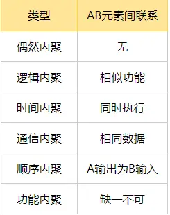 - 判断一个模块是否功能内聚,一般从模块名称就能看出。如果模块名称只有一个动词和一个特定的目标(单数名词),一般来说就是功能内聚