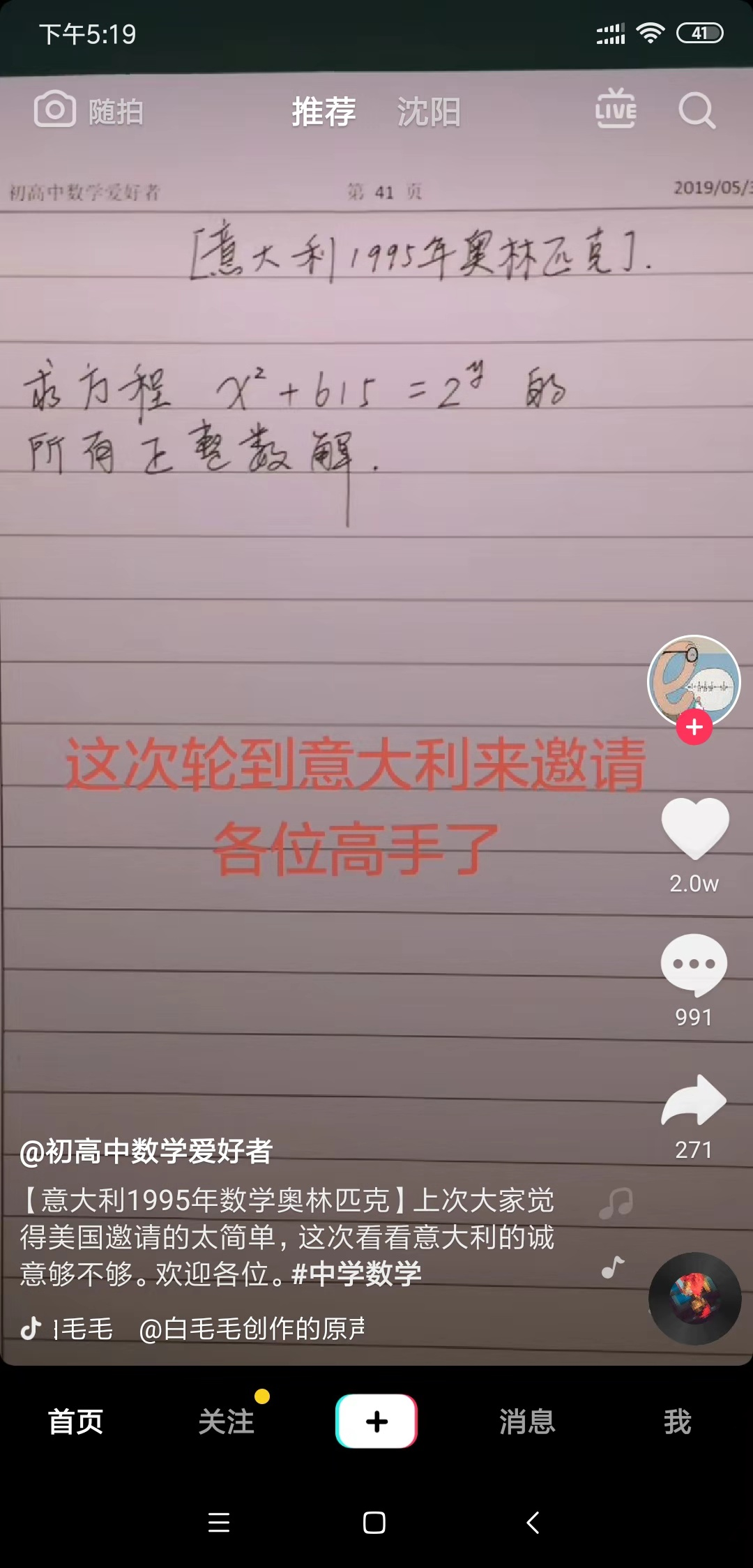 推出了正确答案,很欣慰。但是前提条件要求 y 是偶数才行。通过最初的等式,可以推断出 x 必须为奇数(2^y是偶数,615是奇数,因此x^2为奇数,故x为奇数),但是 y 是否一定为偶数呢,我没法推断。