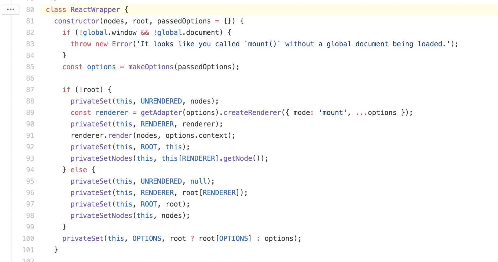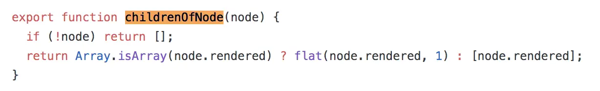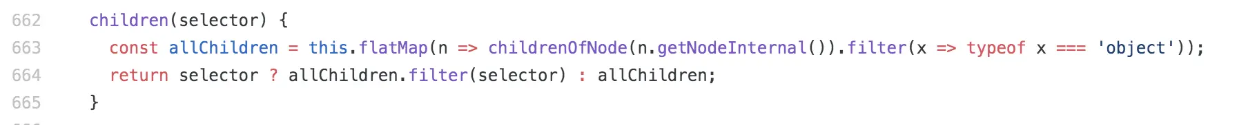 Enzyme 实现了一套类似于 Jquery 的 Api,它的核心代码是构建了一个 ReactWrapper 类或者 ShallowWrapper 包裹 React 组件,区别在于 ShallowWrapper 的类只会渲染组件的第一层,不渲染自组件,所以是一种浅渲染。这里以 ReactWrapper为例,它会输出可用于原子级操作 dom 的 api,以 children() api 为例,我们知道 jq 中的 children() api 可以获取某 dom 节点的全部子节点,Enzyme 是这样做的: