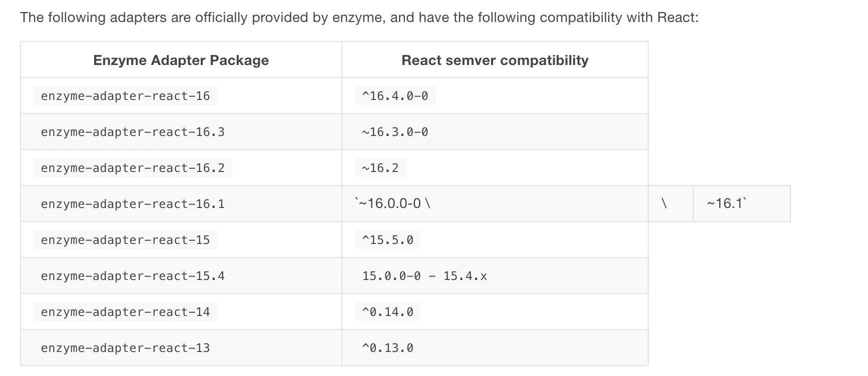 要完成渲染测试,还需要 Enzyme Adapter 库的支持,由于React 版本的不同,Enzyme Adapter的版本也不一样。Enzyme Adapter 顾名思义是为了适应不同的 React 版本,它和 React 版本对应关系如下图(官网):