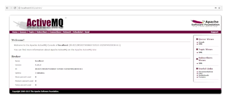 /apache-activemq-5.15.3/bin/win64/目录下双击activemq.bat文件,在浏览器中输入http://localhost:8161/admin/, 用户名和密码输入admin即可