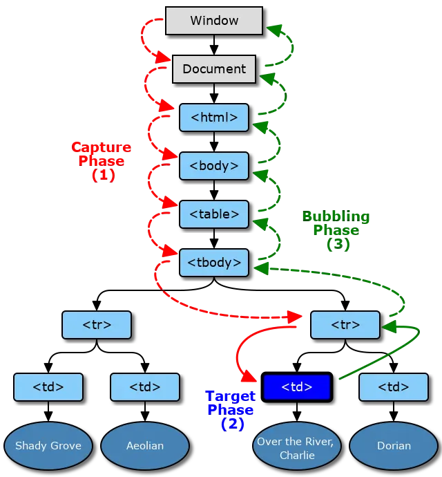 DOM2级事件规定事件包括三个阶段: ① 事件捕获阶段 ② 处于目标阶段 ③ 事件冒泡阶段