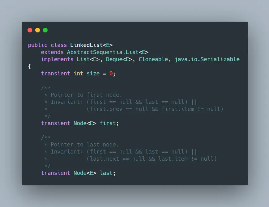 LinkedList 底层使用的是双向链表数据结构(JDK1.6之前为循环链表,JDK1.7取消了循环。注意双向链表和双向循环链表的区别)。LinkedList 包含了3个重要的成员: