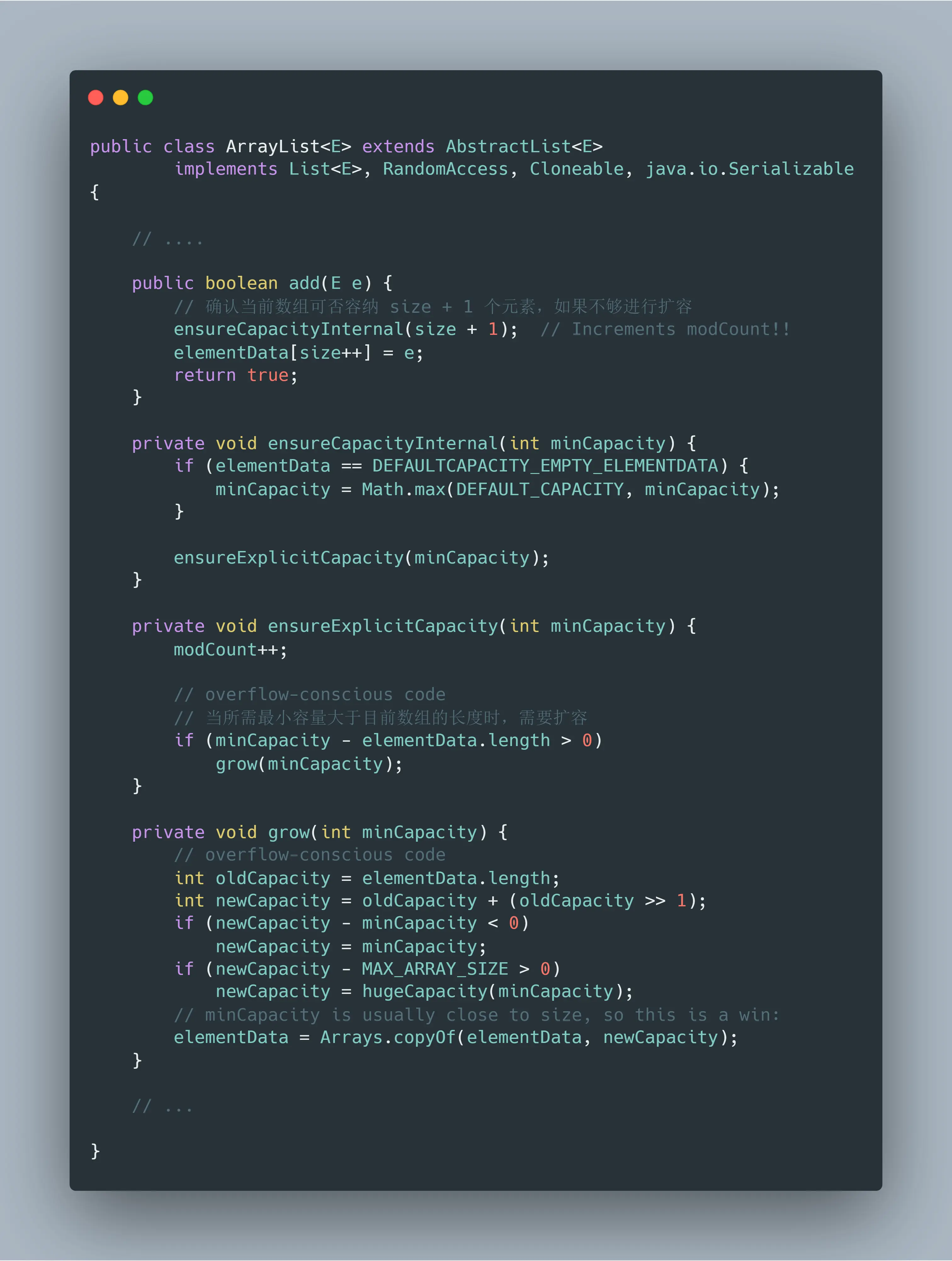 add()方法开始入手 ensureCapacityInternal(size + 1)确认当前数组可否容纳size + 1个元素,如果不够进行扩容grow(minCapacity)这就是具体扩容的逻辑- 新容量的大小为