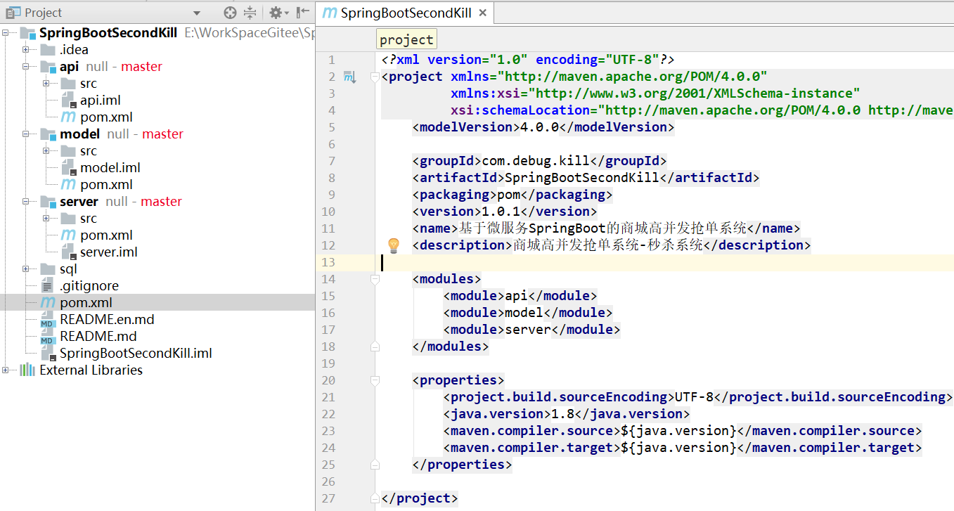 从该目录结构中可以看出,该项目为一个“聚合型项目”,其中,model模块依赖api模块,server模块依赖model模块,层层依赖!最终在server模块实现“大汇总”,即server模块为整个项目的核心关键所在,像什么“配置文件”、“入口启动类”啥的都在这个模块中!