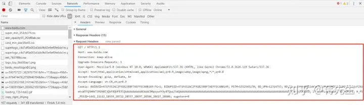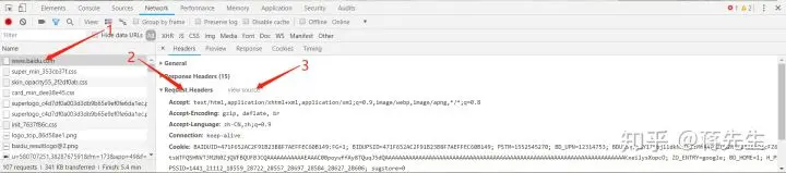 3.地址栏输入网址,以 baidu.com 为例 4.点击Network,查看request,点击view source