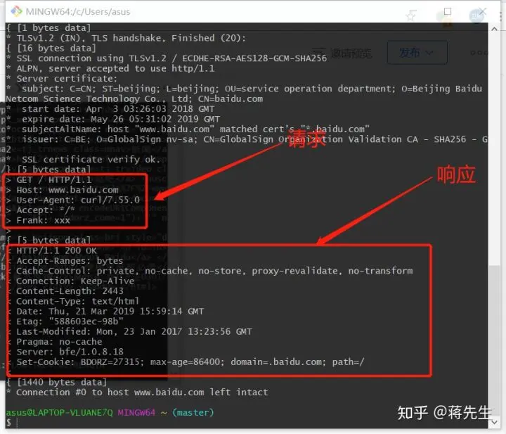 - 输入: curl -s -v -H "Frank: xxx" -- "www.baidu.com"然后回车会产生一大堆代码。