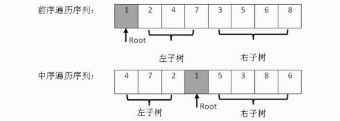 面试题6:输入某二叉树的前序遍历和中序遍历的结果,请重建出该二叉树。假设输入的前序遍历和中序遍历的结果中都不含重复的数字。例如输入前序遍历序列{1,2,4,7,3,5,6,8}和中序遍历序列{4,7,2,1,5,3,8,6},则重建二叉树并返回。