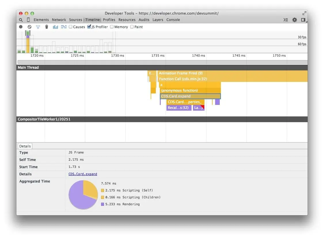 测量 JavaScript 开销和性能情况的最佳方法是使用 Chrome DevTools。通常,您将获得如下的简单记录: