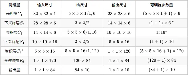 同时给出了 LeNet-5 的网络参数配置: