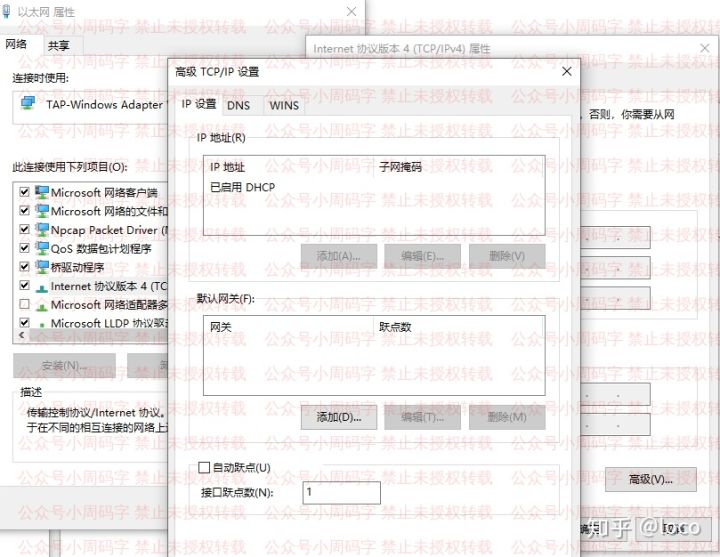 这里我选择直接将【Open虚拟专用网】创建的虚拟网卡的跃点数调低,这样所有流量就会优先走虚拟网卡了,设置如下: