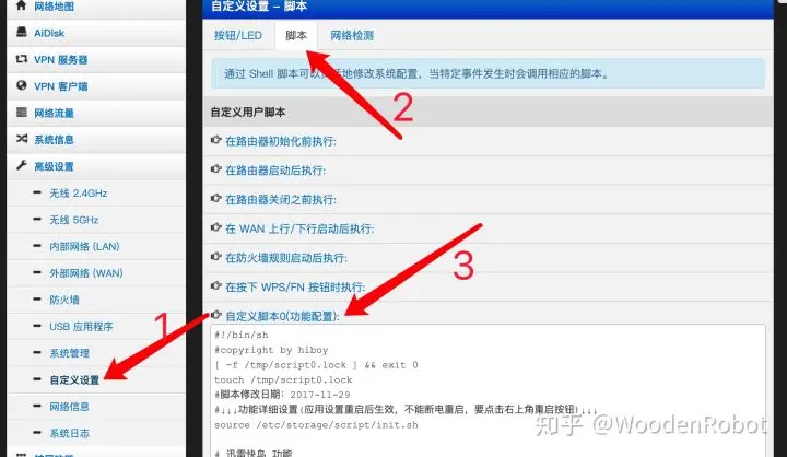 进入路由器后台,在自定义设置的脚本中选择自定义脚本加入下面命令并点击应用本页面设置: