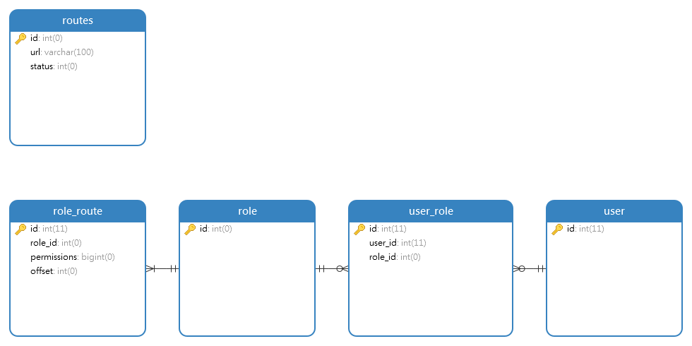 role_route表中的permissions和offset字段描述了一个角色所拥有的权限,表示为{(offset1,permissions1),(offset2,permissions2)…(offsetN,permissionsN)}。即用permissions和offset字段关联routes表的id。例如某个角色在role_route表中有两条记录offset为0,permissions为1和offset为1,permissions为2,那么这个角色完整的二进制集合为10(省略30个0)1,在routes表中所关联的路由id为1和33,即这个角色拥有路由id为1和33的权限。