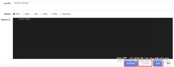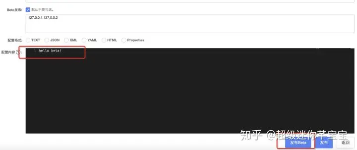 3、 修改配置内容,点击“发布Beta”按钮,即可完成灰度配置的发布: