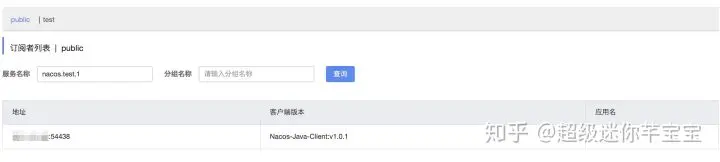 - 进入订阅者列表页面,在“服务名称”输入框输入想要查询的服务名,在“分组名称”输入框输入服务的分组名(默认为DEFAULAT_GROUP),点击“查询”后,得到订阅者的信息,包括IP和端口、客户端版本和应用名。