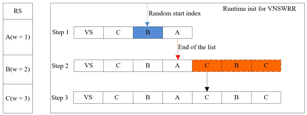 o 当请求到达后从设置的随机起点B位置轮询虚拟节点列表,若轮询到已经初始化的虚拟节点数组的末尾(如上图的Step2红色箭头指向的位置),则初始化第二批虚拟节点(如上图Step2对应的红色节点),当所有虚拟节点初始化完后将不再做初始化工作(如上图的Step3对应的状态);