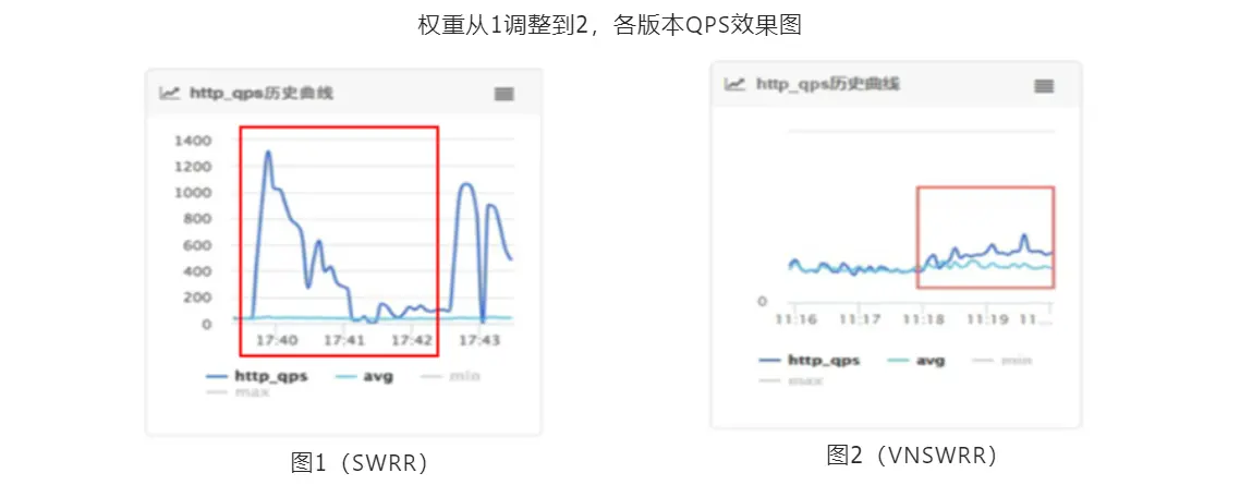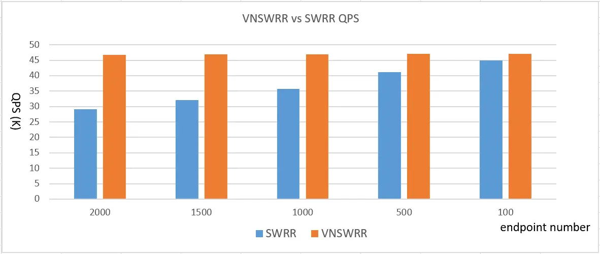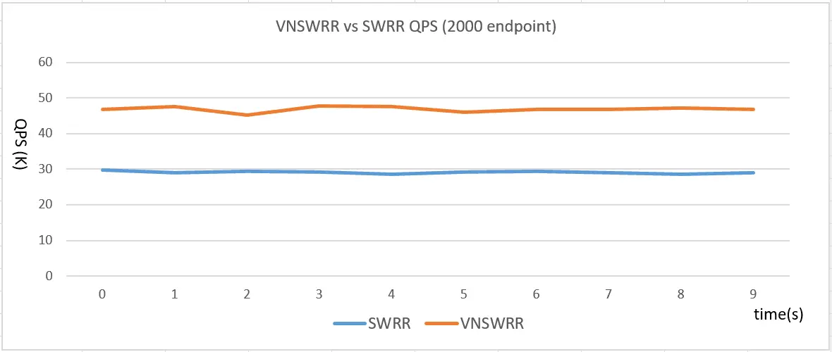 正是这种大流量场景下才暴露出 Nginx 的一些问题,所谓业务与技术相辅相成,业务可促使新的技术诞生、新的技术赋能创造新的业务。 VNSWRR 算法即拥有 SWRR 算法的平滑、分散特点,也避免了其缺陷。同时在新算法下时间复杂度也从 O(N) 调整为 O(1) ,在大规模场景下 VNSWRR 的QPS处理能力相对于 Nginx 官方的 SWRR 算法提升60%左右。