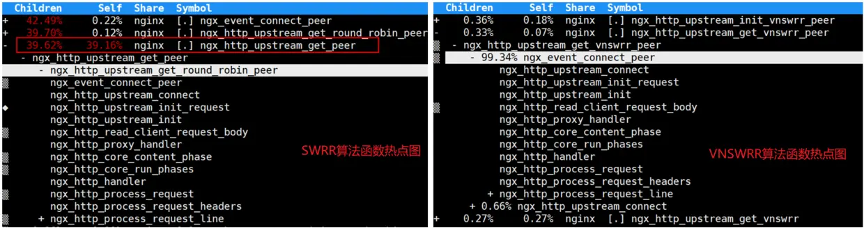 在同等压测环境下(wrk压测工具、500并发、长连接场景、upstream配置2000个server), Nginx 官方的 SWRR 算法CPU消耗占比高达39%(ngx_http_upstream_get_peer函数)。而 VNSWRR 算法在同等条件下CPU消耗占比只有0.27%左右(ngx_http_upstream_get_ VNSWRR 函数),显而易见 SWRR CPU消耗要高出一个数量级。