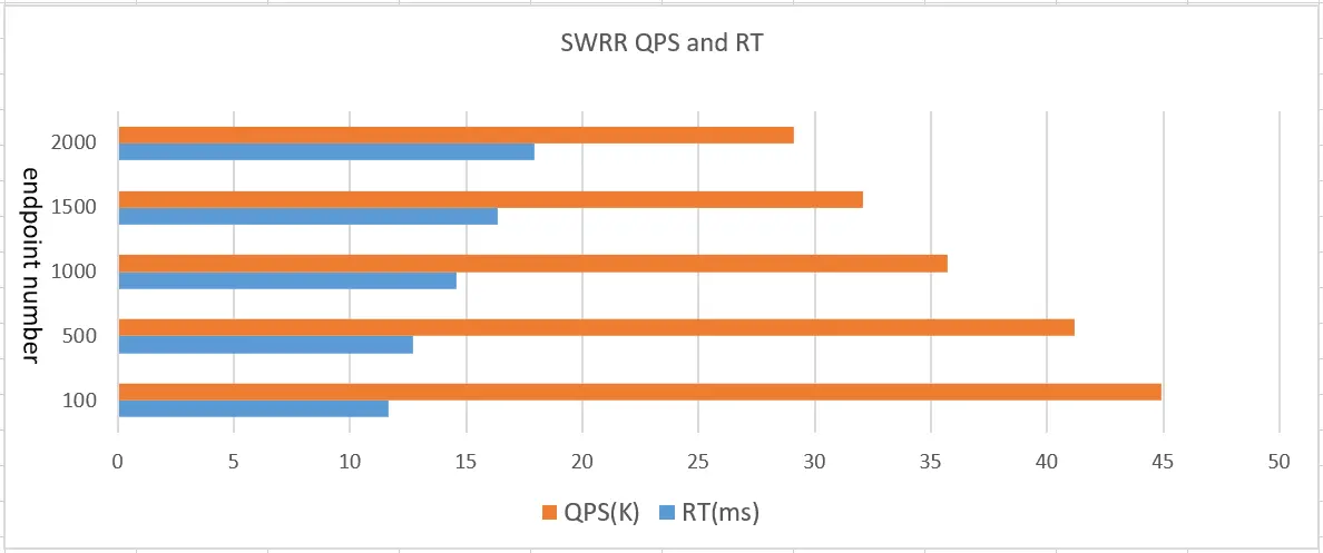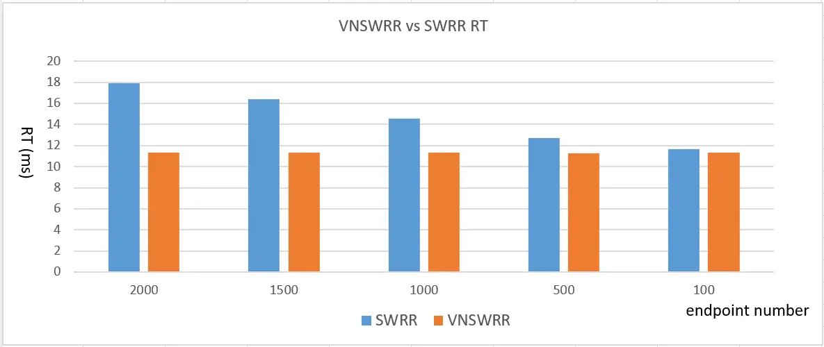 从图中可以发现在 SWRR 算法下当 upstream 里面的 server 数量每增加500台,则 Nginx 的 QPS 处理能力下降10%左右、响应RT增长1ms左右,而在 VNSWRR 算法下 Tengine 的 QPS 处理能力及RT基本上变化不大。