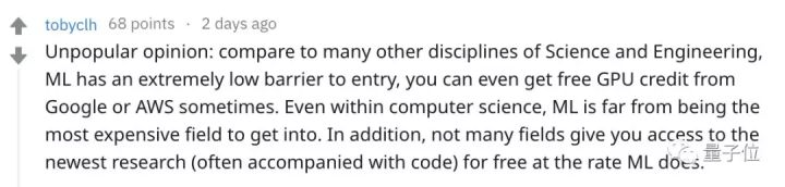 机器学习的准入门槛很低了,有时候甚至能从Google和AWS上拿到免费的GPU时间。即使是在计算机科学领域,ML也不是最贵的。更何况ML是非常开放的,很多最新研究成果都能轻松获取。